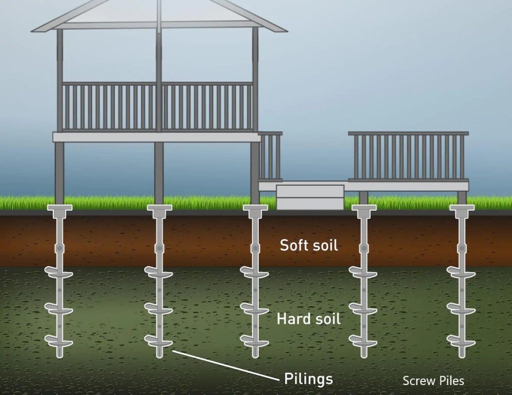- Tiang besi atau konkrit dipacak dalam tanah hingga capai lapisan keras.